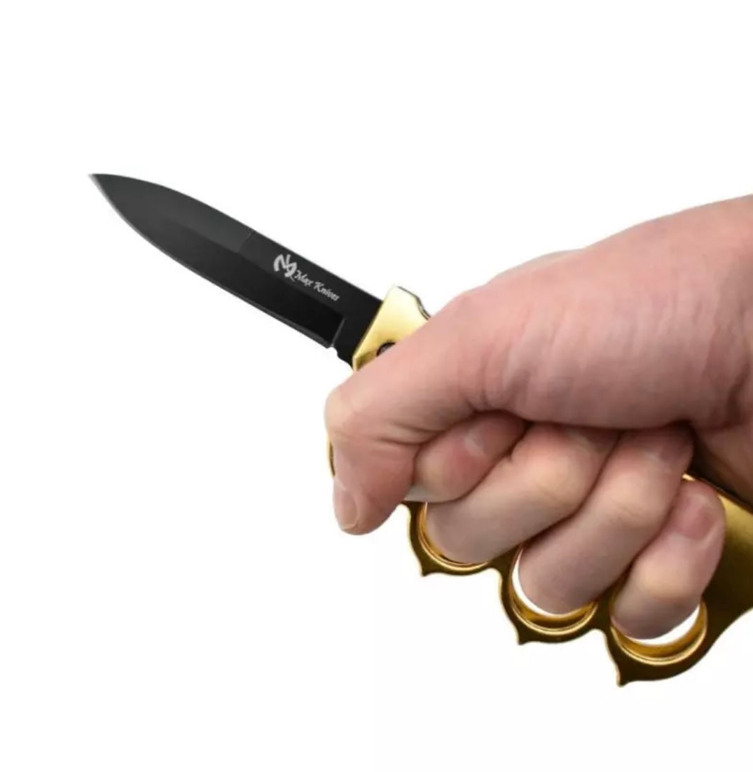 La lama nera in acciaio 7Cr17 rinforzato al carbonio, ben affilata a filo singolo e liscio, garantisce resistenza, durata e capacità di taglio elevata. L’apertura laterale automatica è azionabile tramite una leva a scatto, ed è dotata di blocco di sicurezza, per un utilizzo affidabile. L’impugnatura, ergonomica e antiscivolo, è realizzata in metallo dorato in stile classico tirapugni, per una presa stabile anche nelle situazioni più critiche. Il tutto è completato da un codolo frangi-vetro in carbonio tungsteno, utile in situazioni d’emergenza, e da una clip posteriore a scomparsa per il trasporto alla cintura.
